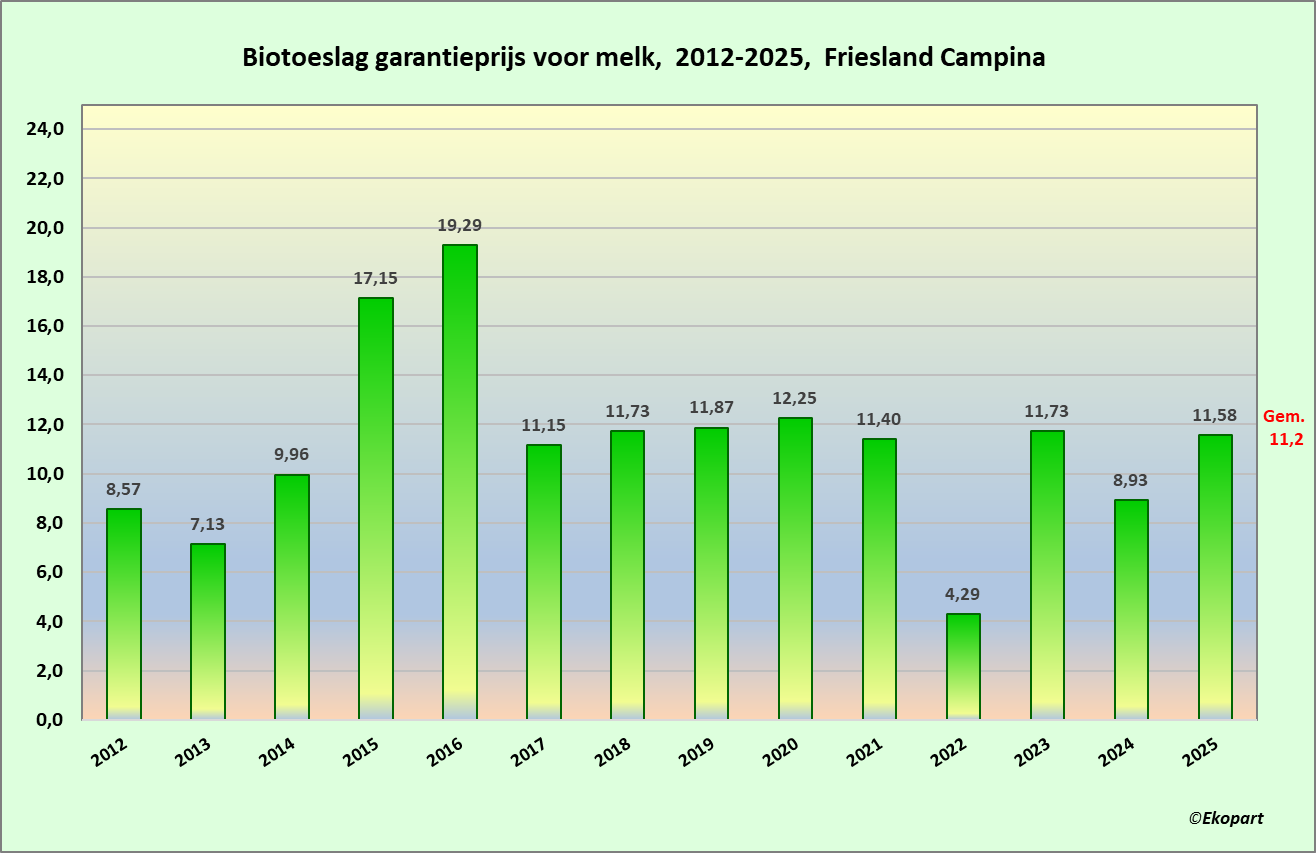 Over de periode vanaf 2012 tot heden is de gemiddelde Bio-toeslag ruim 11 ct. per kg melk .